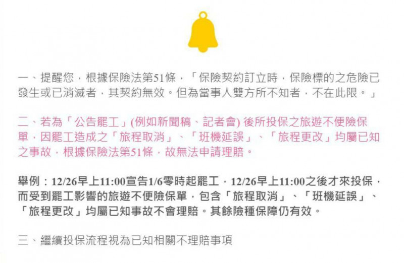 長榮機師確認取得合法罷工權,民眾搶買「旅遊不便險」,新安產險公告投保注意事項。 (記者李靚慧翻攝)